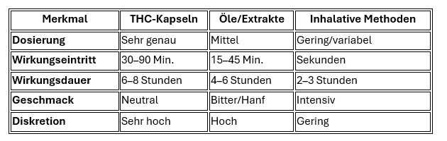Um die Vorteile von Cannabis-Kapseln besser einzuordnen, hilft ein Vergleich mit anderen gängigen Darreichungsformen: