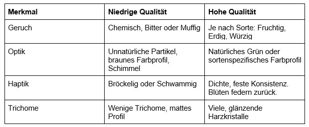 Optik, Geruch und Geschmack geben eine erste Aussage über die Qualität der Cannabisblüten. Hochwertige Cannabisblüten bieten nicht nur eine angenehmere Konsumerfahrung, sondern haben auch einen höheren Wirkstoffgehalt sowie einen besseren Geschmack.